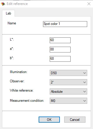 - Right-mouse click in the "Sample color: New book" window and select "New measurement (Ctrl+M) to add new reference color by CIE L*a*b* values.